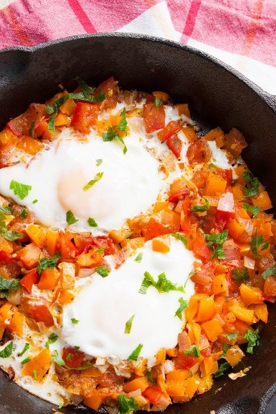Want to add a twist on your regular breakfast eggs? Make a Shakshuka - a dish of eggs poached in Sauteed vegetables! It's a super easy and tasty one-pot dish, and a healthy one at that. Serve it with with bread or pita to mop up the sauce and humus on the side.